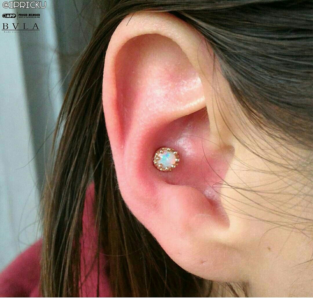 In my head, I can just picture the client seeing this piece and not being able to resist! This fresh conch piercing features an 18k yellow gold “crown” end set with a genuine opal, creating a stunning, regal look. I absolutely love adorning my clients with such beautiful, high-quality jewelry. Ready to upgrade your piercing with exquisite pieces like this? Text me today to schedule your appointment and let’s make your piercing dreams come true!