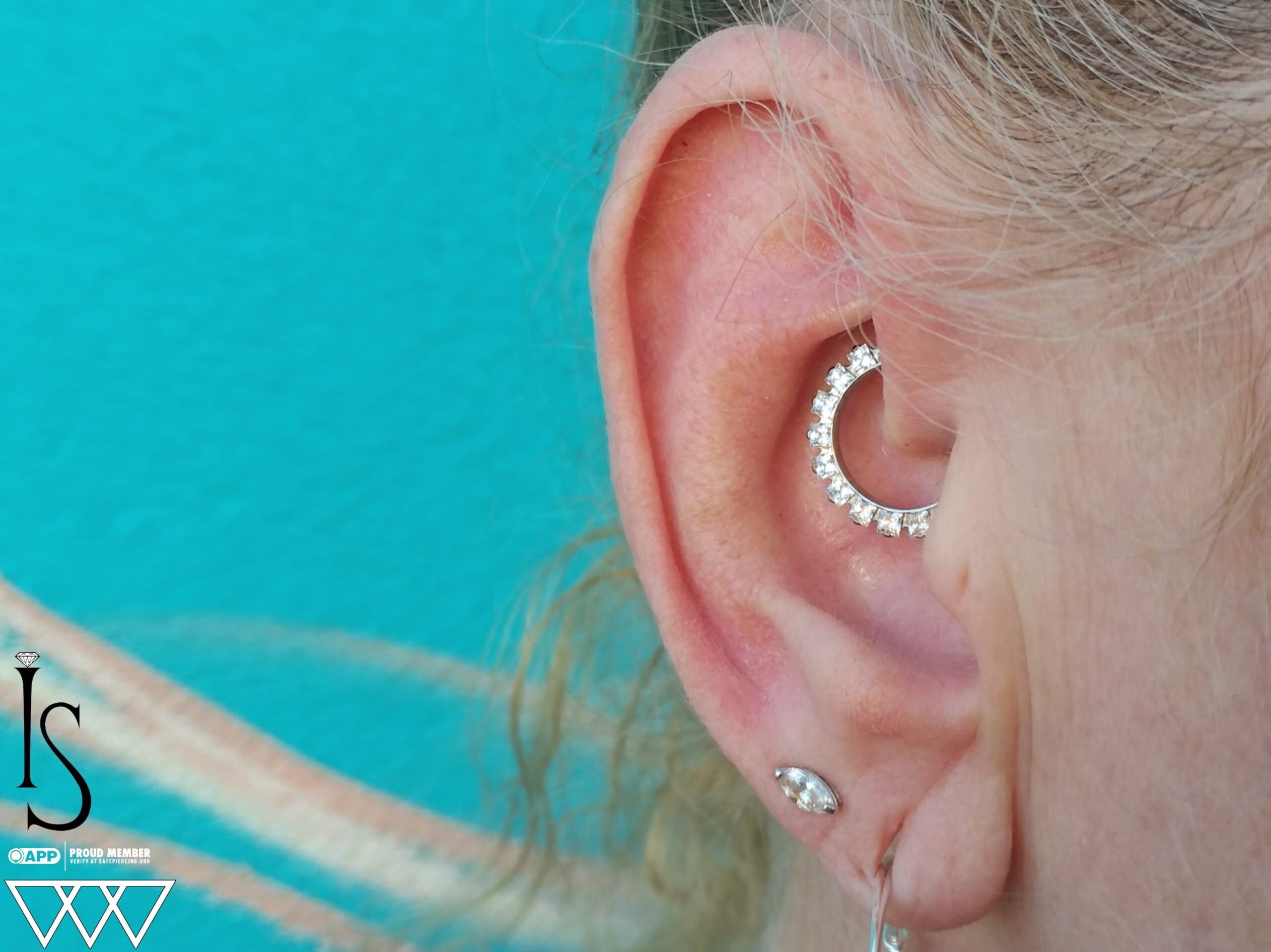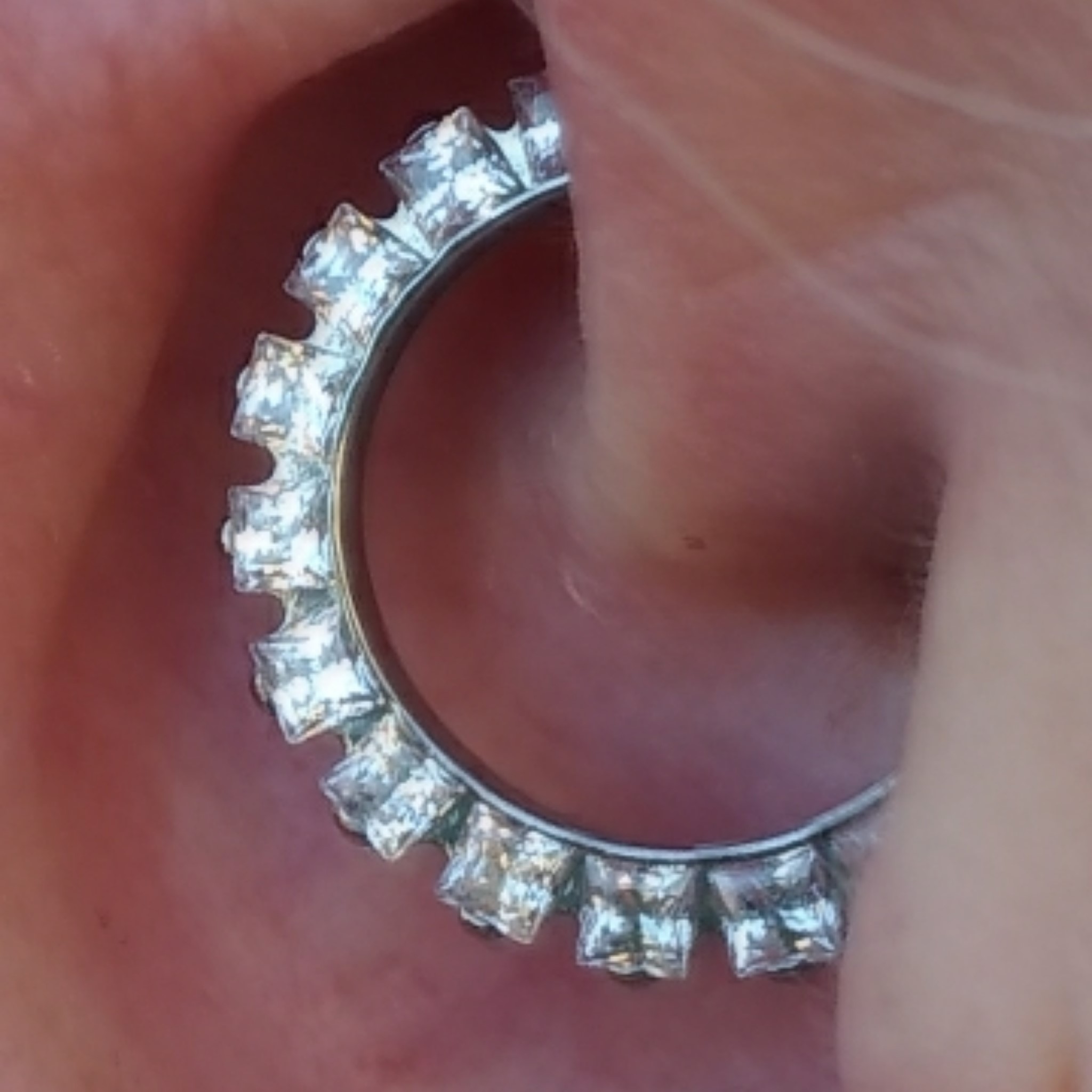 It never gets old popping an Industrial Strength septum clicker into a daith piercing. This princess cut gemmed septum clicker, set with clear Swarovski gemstones, looks absolutely fabulous in this piercing. Whether you are going for a bold or subtle look, this clicker adds the perfect touch. Thanks for choosing me for your piercing and jewelry upgrades It is always a pleasure to make your piercing dreams into a reality!