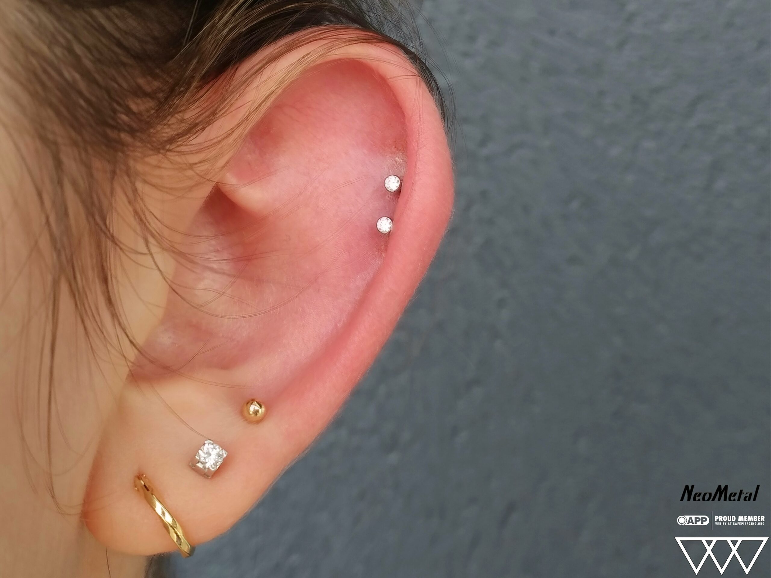 Fresh set of helix piercings for this lovely client, featuring two titanium bezel-set clear Swarovski gemstones from NeoMetal. Cartilage piercings like these typically take at least 6 months to heal, and downsizing the jewelry after 6-8 weeks is essential for proper healing. If youโre considering a helix piercing, Iโm here to guide you through the process and ensure the best results. Book your appointment today to get started on your next piercing!