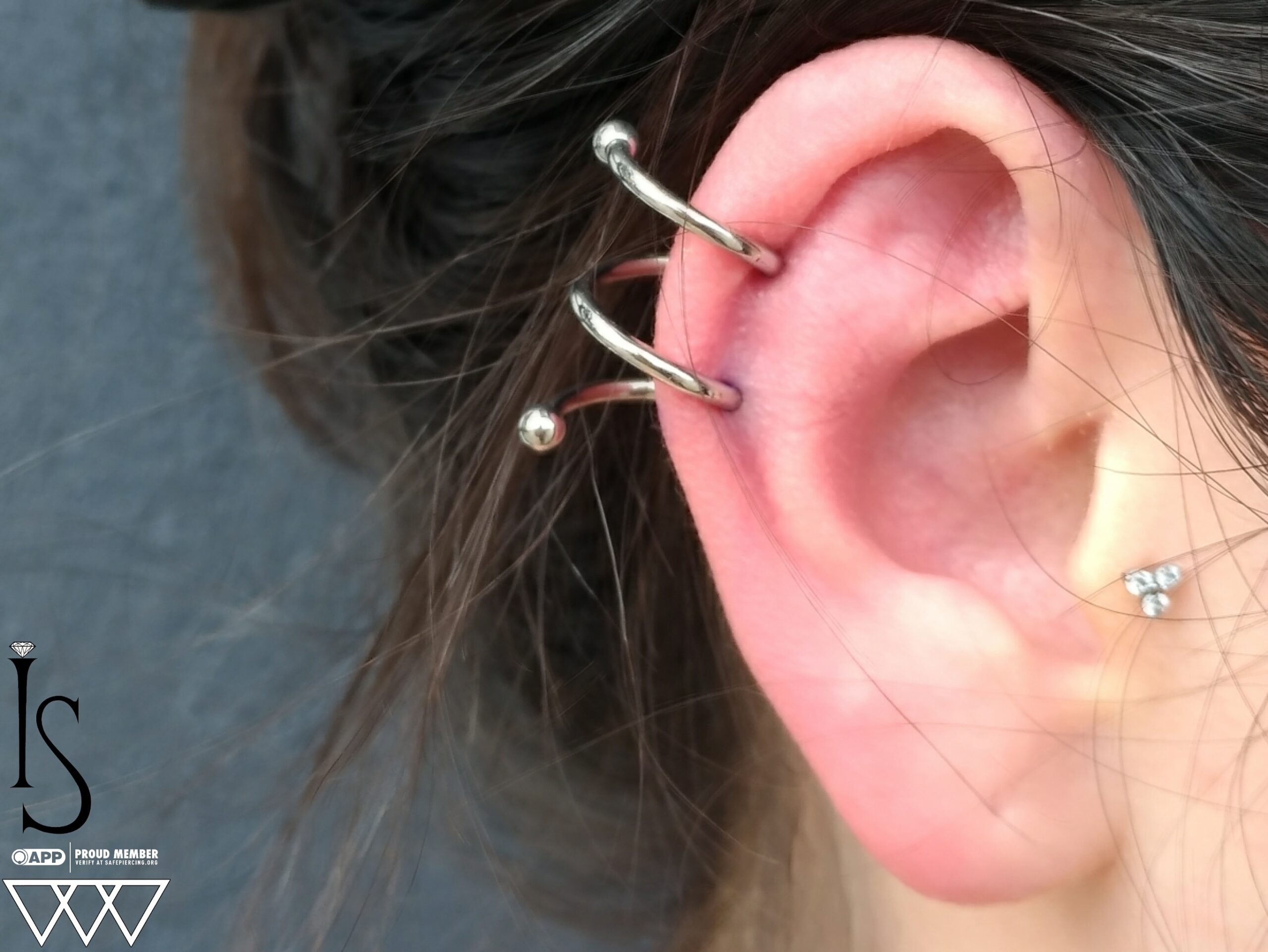 Check out this beautiful helix piercing combo! The top helix is fully healed, while the bottom one is fresh. Both piercings are connected by a single titanium continuous circular barbell from Industrial Strength. Helix piercings typically take 6 months to a year to fully heal, so it’s important to care for them properly during the healing process. If you’re looking to add a helix piercing to your ear curation, book your appointment with me today for high-quality jewelry and expert care!