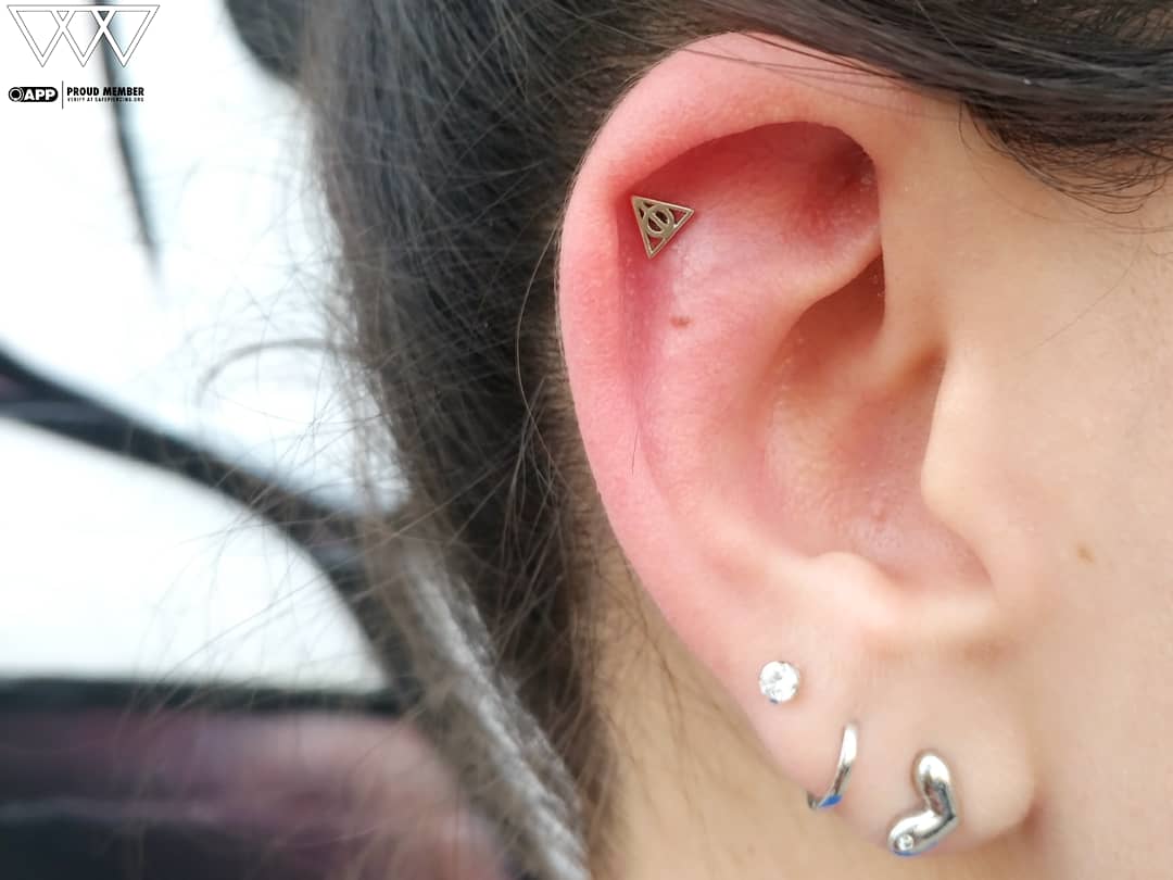 Here’s a fresh piercing I performed during my guest spot at Ahimsa Piercing Studio in Brooklyn, New York. The client chose a logo that resembles something from Harry Potter, but I’m not entirely sure of its origin. What I do know is that it fit perfectly in their ear! It’s always a great feeling when the jewelry aligns so well with the anatomy. Thanks for trusting me with this one, and I’m really happy with how it came out. Thanks for looking!