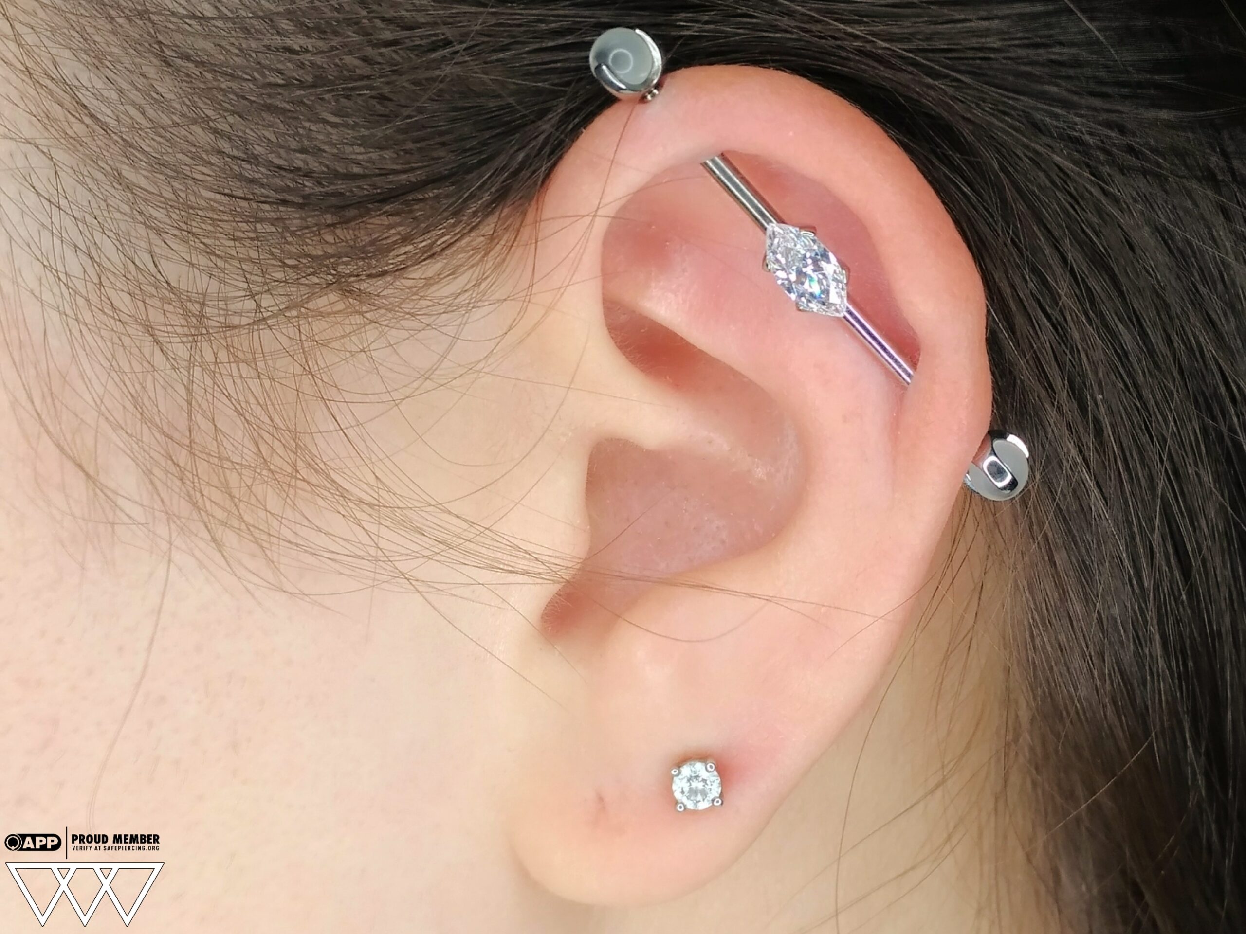 I don’t often get the chance to photograph industrial piercings, but this client came back for a jewelry upgrade on a healed piercing. The beautiful 3-prong claw moonstone ends and marquise gem setting from Industrial Strength add a touch of elegance to this industrial piercing. Whether you’re getting a new piercing or upgrading your jewelry, I offer expert piercing services and the highest quality jewelry for every style. Thanks for trusting me with your piercing journey!