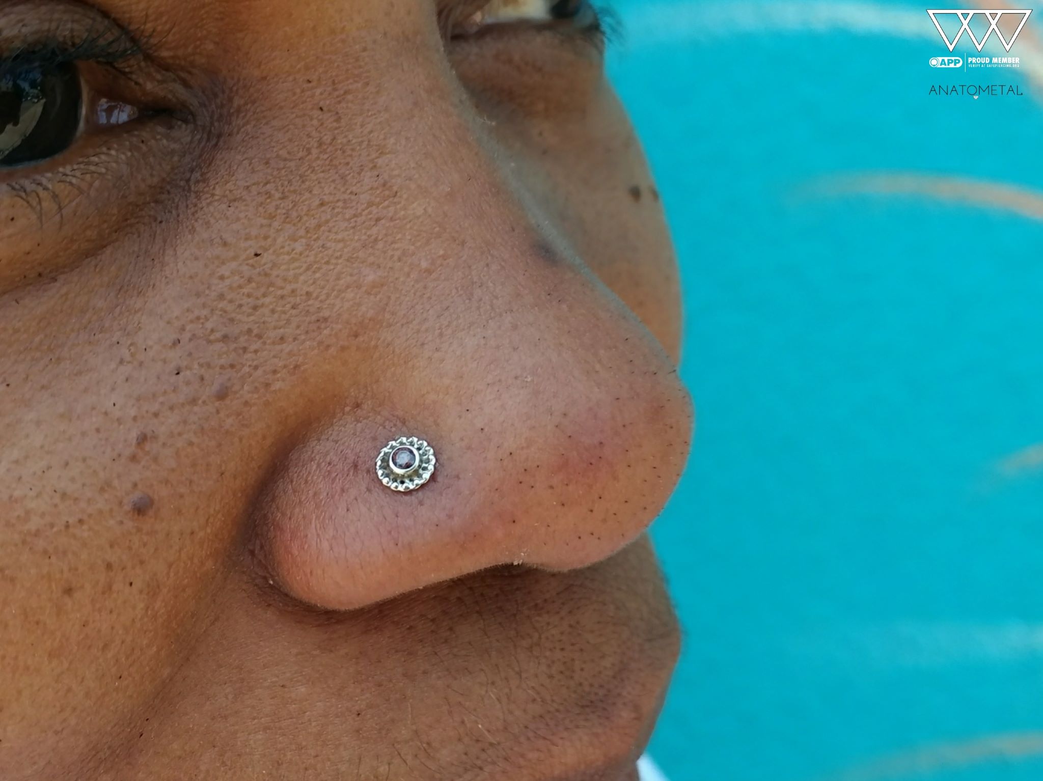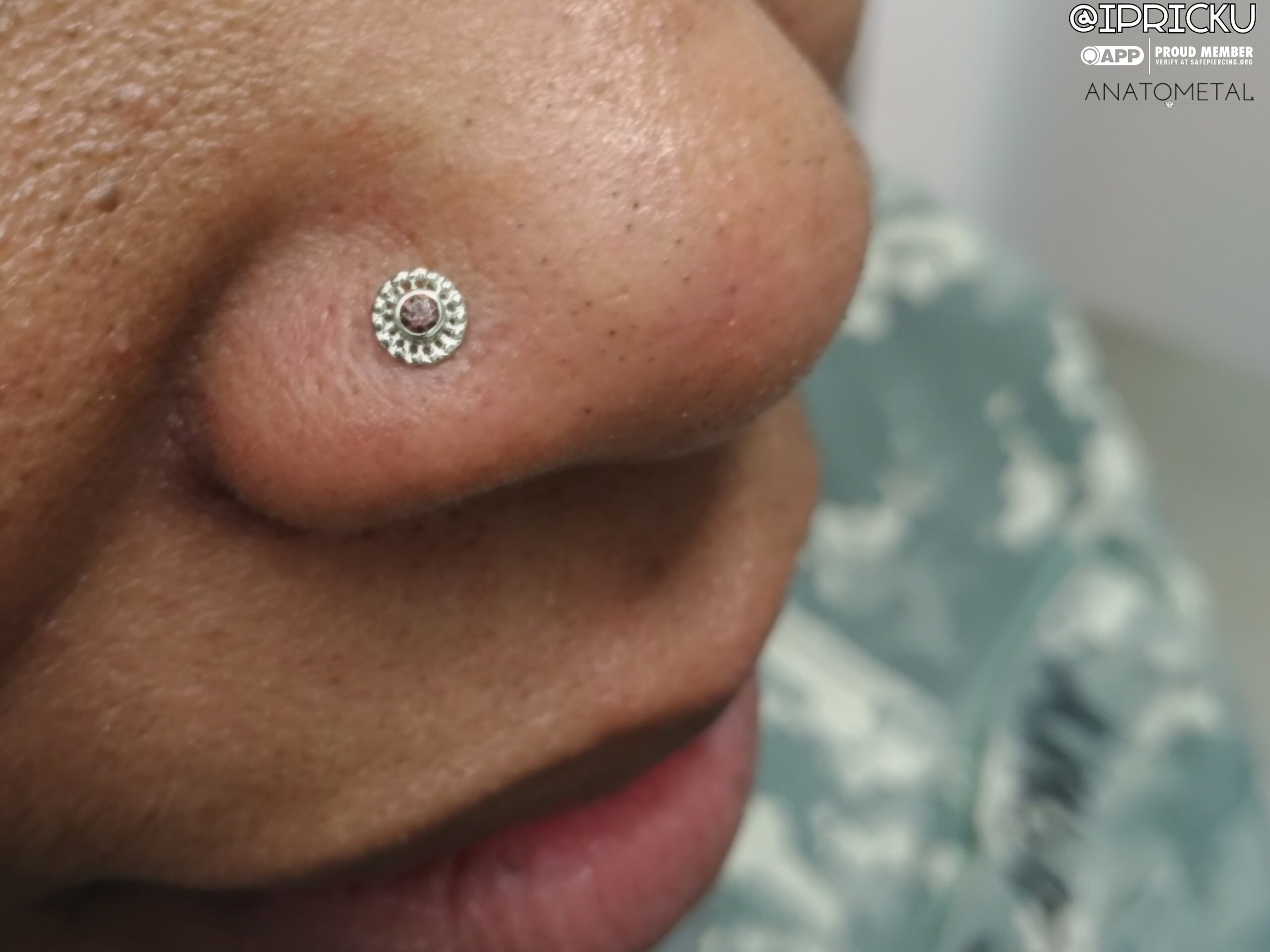 Here’s a healed nostril piercing where I swapped out the jewelry to an exquisite 18k gold “Virtue” threadless end from Anatometal, featuring a rich chocolate Swarovski gemstone. This high-quality jewelry sits perfectly in the piercing and adds a touch of elegance. Remember, nostril piercings typically take 6 months to a year to fully heal, so be patient and take care of your piercing during the process. Thanks for trusting me with this beautiful upgrade!