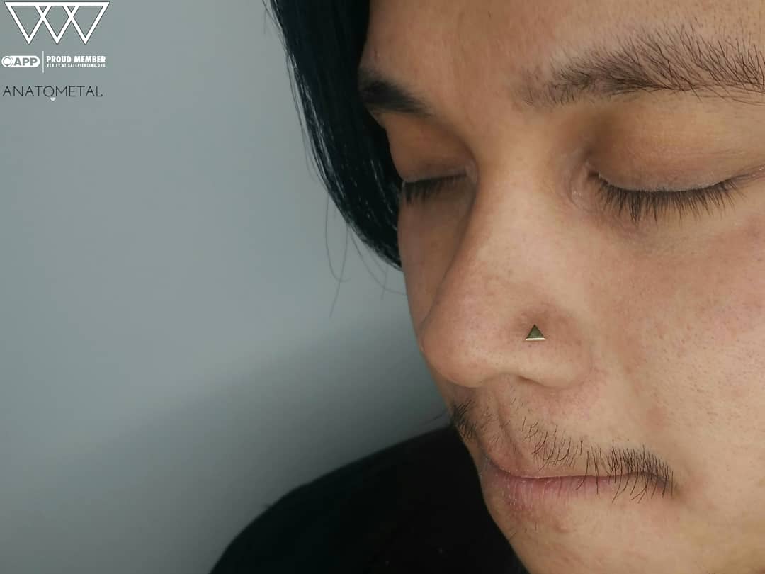 Triangular shapes always seem to look amazing in nostril piercings, and this client had perfect anatomy for it. I was thrilled to install this 18k gold triangle threadless end from Anatometal—simple, bold, and super eye-catching. Nostril piercings are a great way to showcase elegant, high-quality jewelry, and this piece definitely made a statement. If you’re ready to elevate your look with gold nostril jewelry, I’ve got you covered. Thanks for the support!