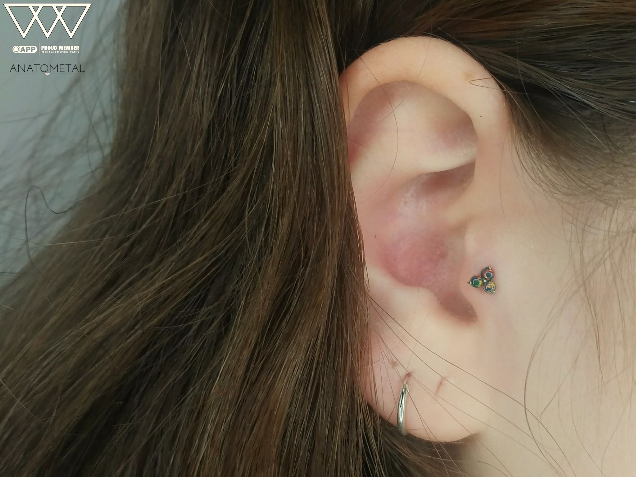 Healed tragus piercing I performed, and I had the pleasure of swapping out the jewelry to this stunning 18k white gold “Trio” threadless end from Anatometal. Set with beautiful black opals, this piece enhances the piercing with its sleek, elegant design. Whether you’re upgrading your existing jewelry or getting a new piercing, I’m here to help you select the perfect piece. Book your appointment today and let’s create something amazing for your body!
